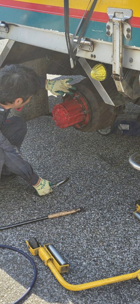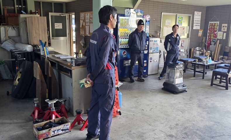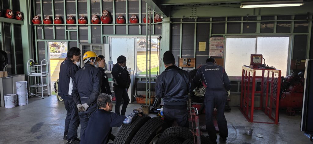 みなさんこんにちは、先日タイヤメーカーさんに来ていただいてタイヤの組み換え、交換の際の基本的な事、又注意点などを学びました。下司運送ではドライバーの皆さんが協力して自社にてタイヤ交換を行っております。特に率先して行ってくれている人に参加してもらい行いました。