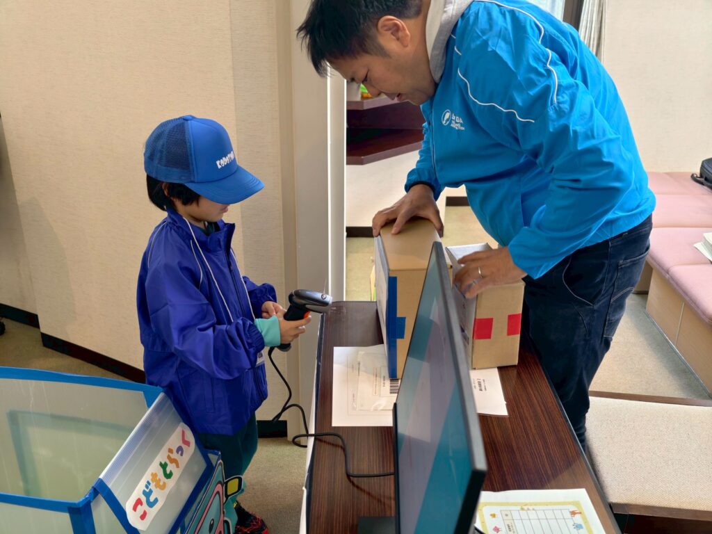 トラックに見立てた台車で荷物を運ぶ体験をしてもらいました。