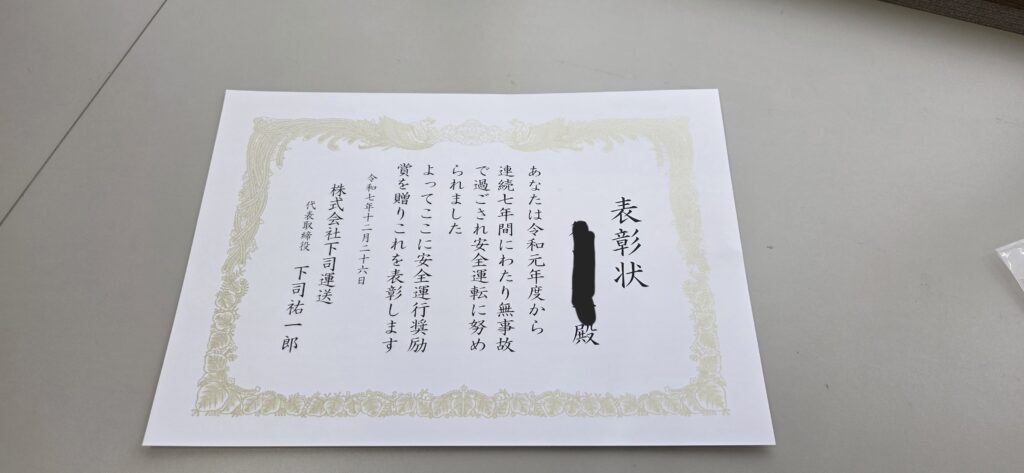 下司運送では、このような賞を行っています。1年間無事故であれば賞を授与していますが、3年、5